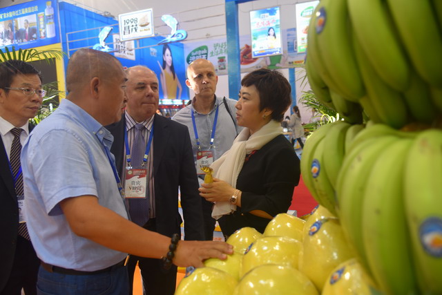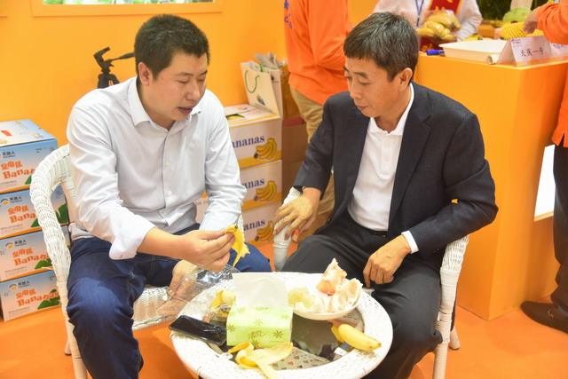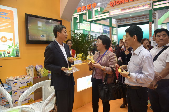 12日开幕式当天上午,省委副书记、省长刘赐贵等领导先后来到“天地人”展厅视察。“天地人”主展厅。高大宏伟的擎天香蕉大柱,吸引了展会众多市民群众、客商驻足拍照留影、品尝公司新培育的特种香蕉 “天蕉”和红心、黄心及水晶柚子,各大媒体记者络绎不绝争先采访公司董事长徐咏梅女士、董事会秘书兼副总裁徐建荣、副总裁赵军介绍公司发展理念、管理模式、热带水果种植经验及公司配合政府帮扶脱贫等工作。公司此次参展的香蕉、柚子等水果,主展厅、分展台供不应求,15日闭馆前销售一空。