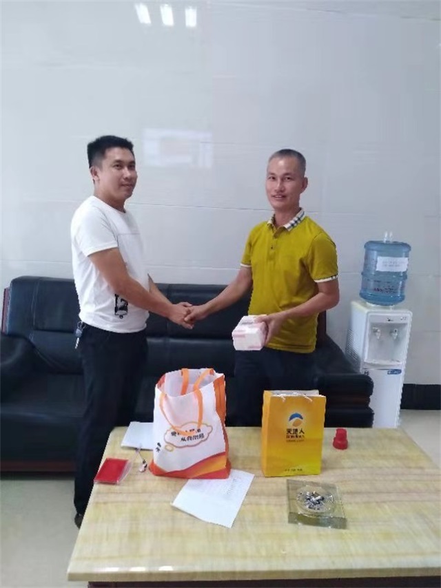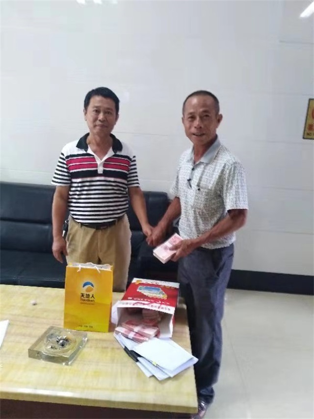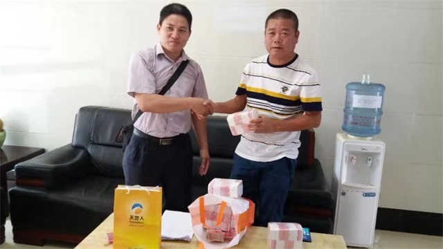 天地人财务代表给波莲镇村委会代表发分红,代表们脸上洋溢着笑容